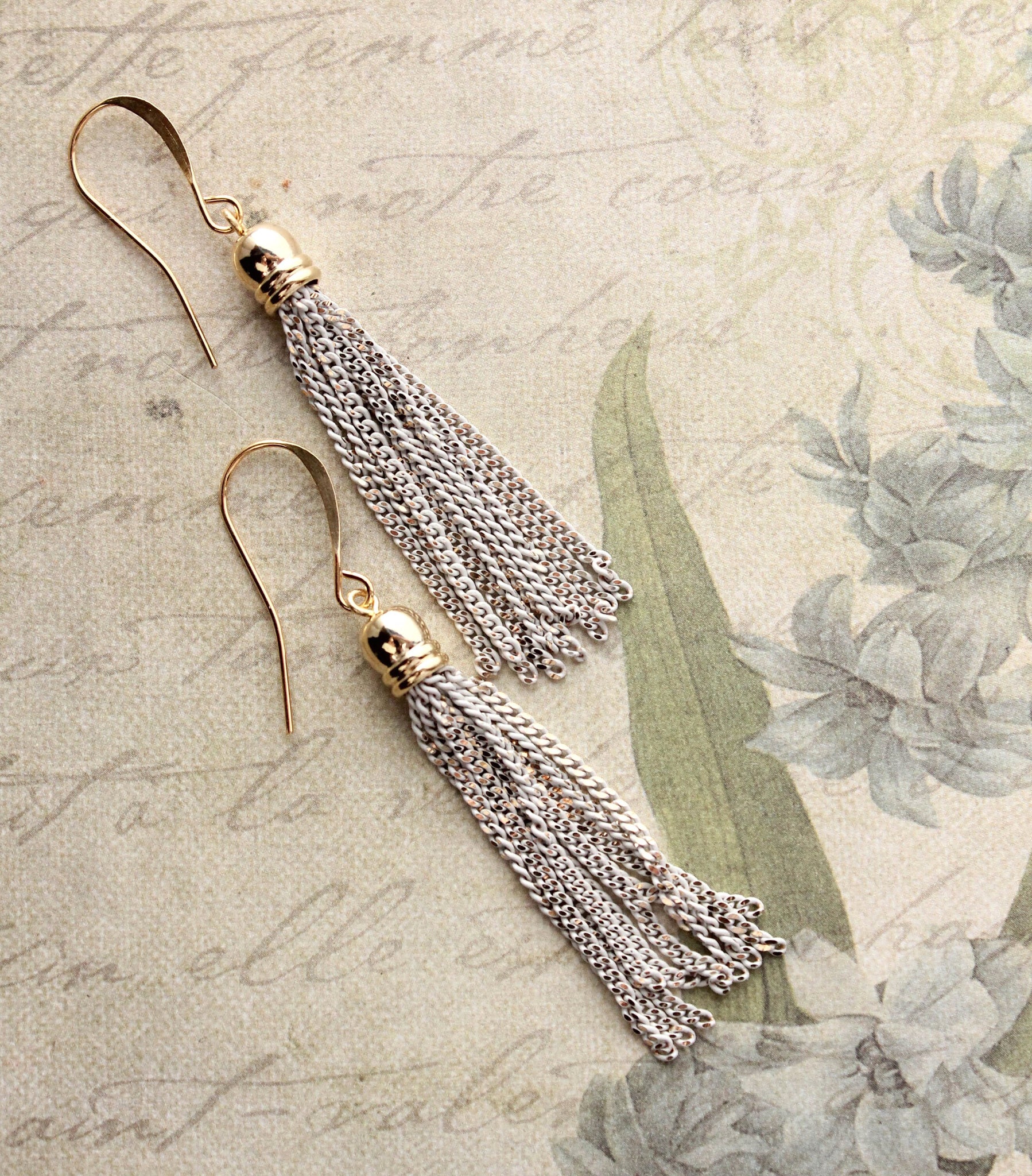 These are gorgeous chain tassel earrings in gold and ivory cream. The chain is painted patina gold plate and is light weight with beautiful movement and sway.