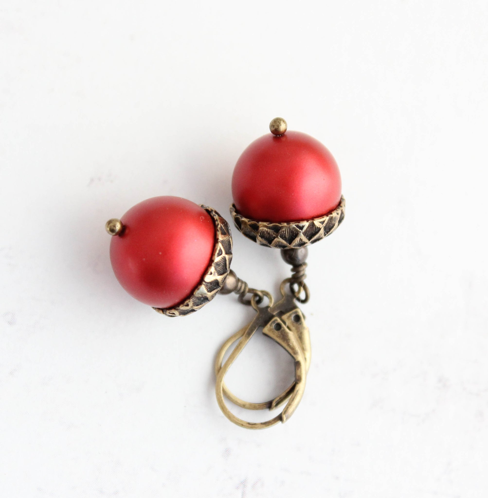 These are gorgeous nature inspired bright red pearl acorn drop earrings! These earrings are matte red swarovski glass pearls and the acorn top is antique brass. These drop earrings have a lovely simplicity with lots of detail! The perfect nature inspired dangle earrings for Christmas and all the other Seasons! These are a light weight and are easy to wear all day!