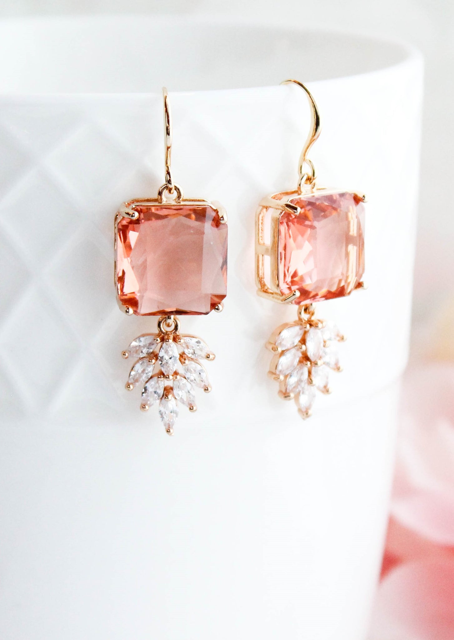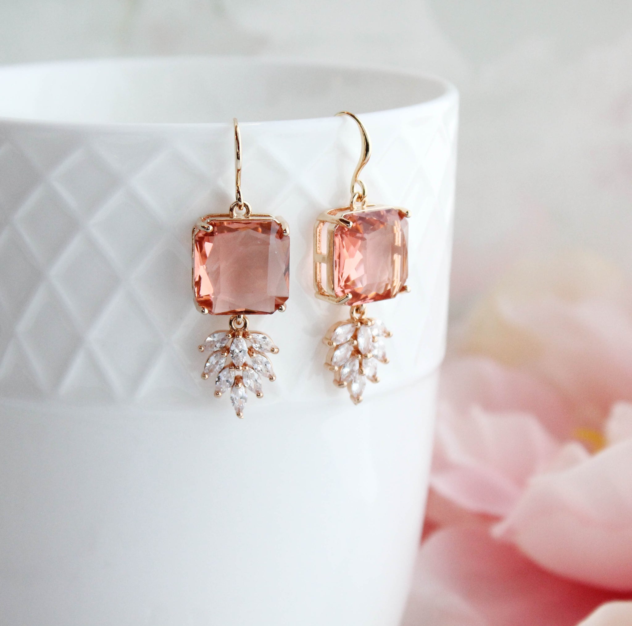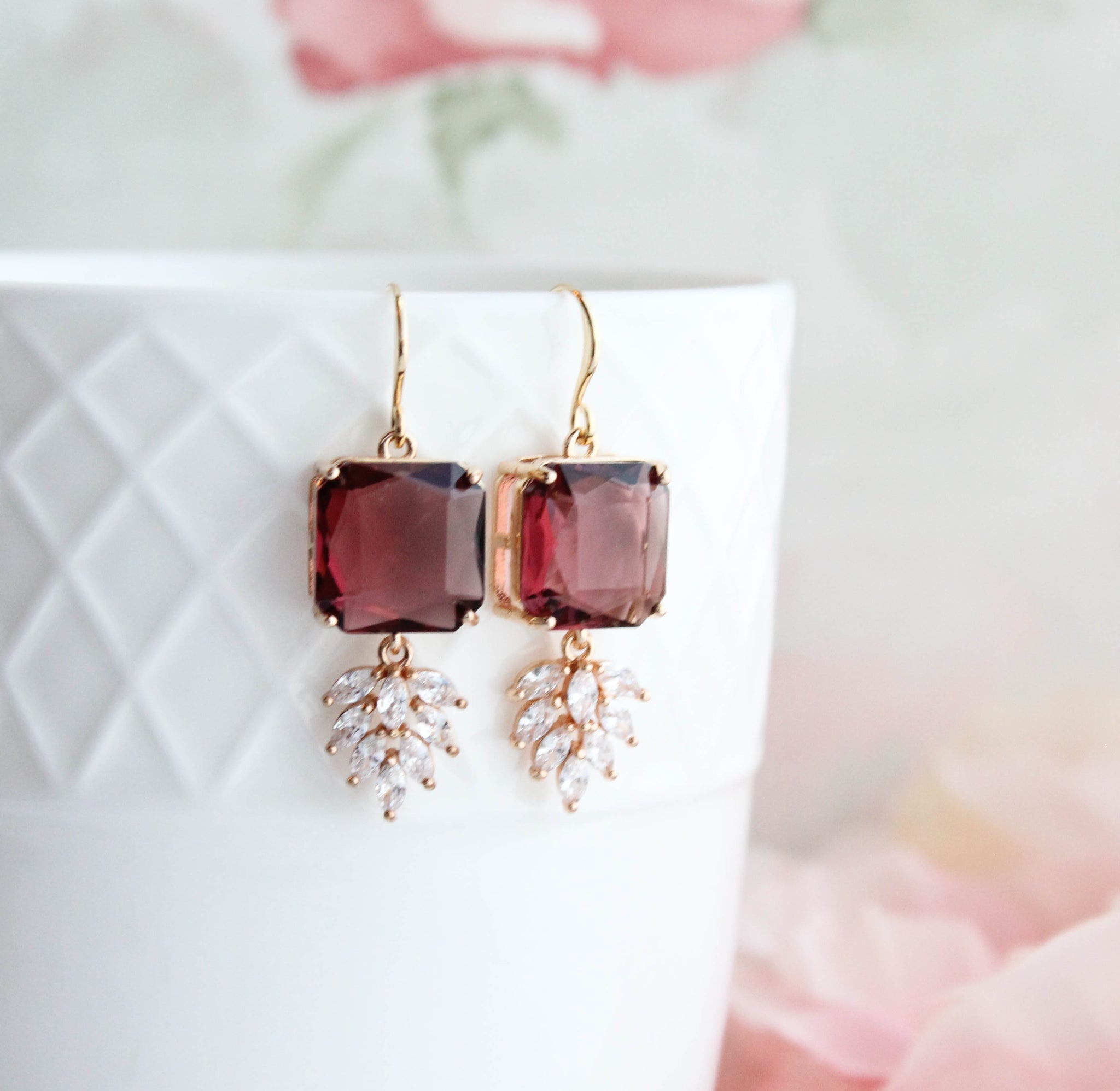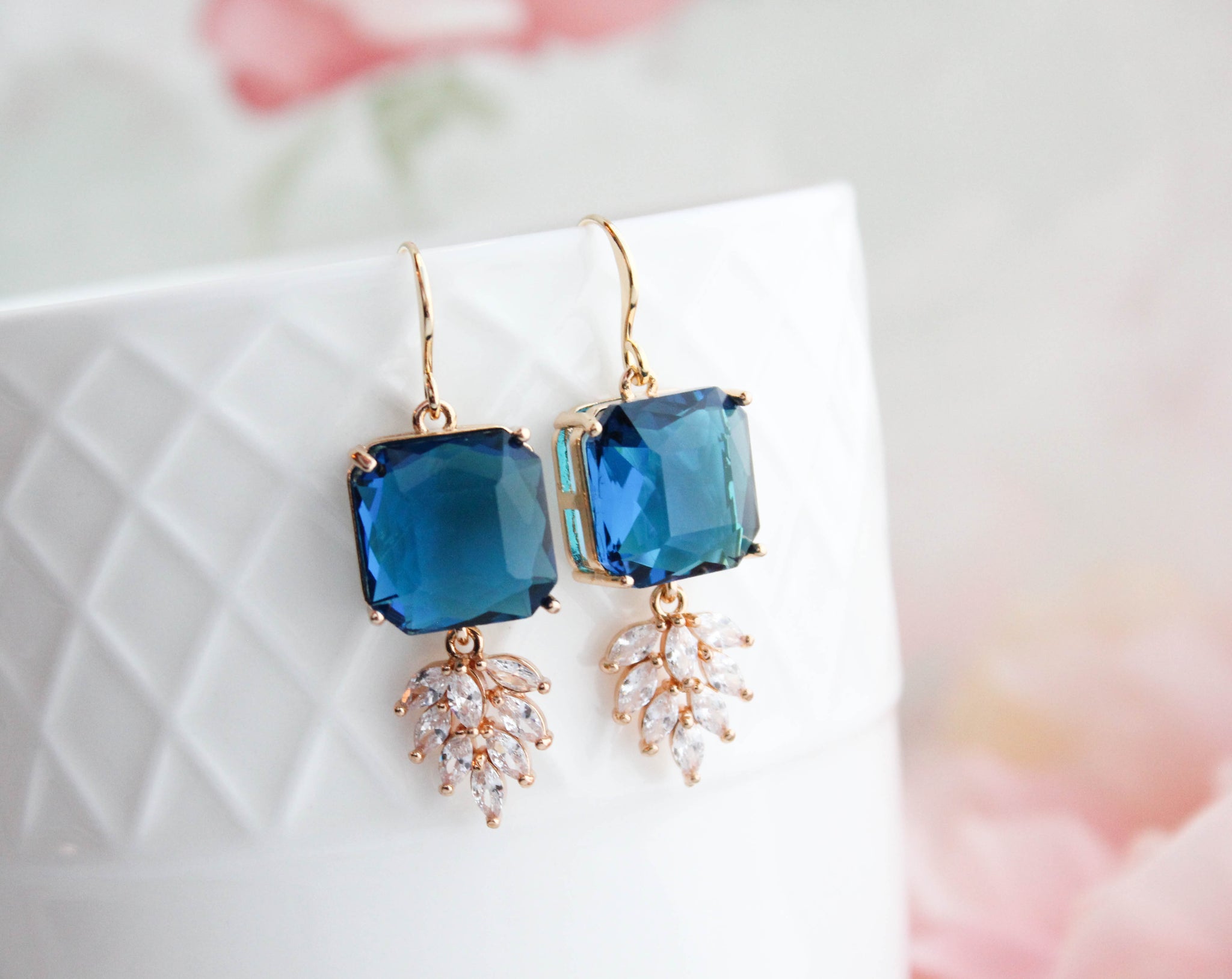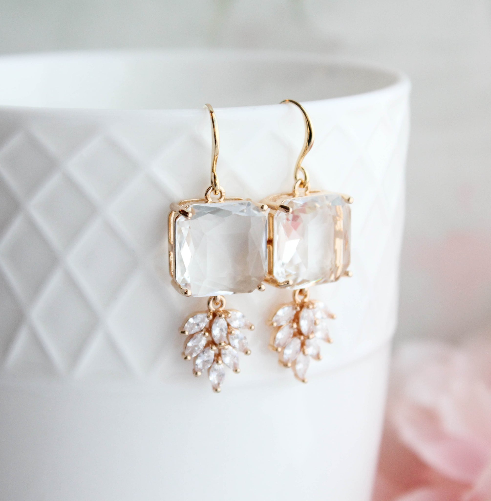These are gorgeous Art Deco inspired sparkly glass dangle earrings. The top square glass stone is set in gold and dangling at the bottom is a sparkling multi-stone zircon leaf. These glam earrings catch the light beautifully.