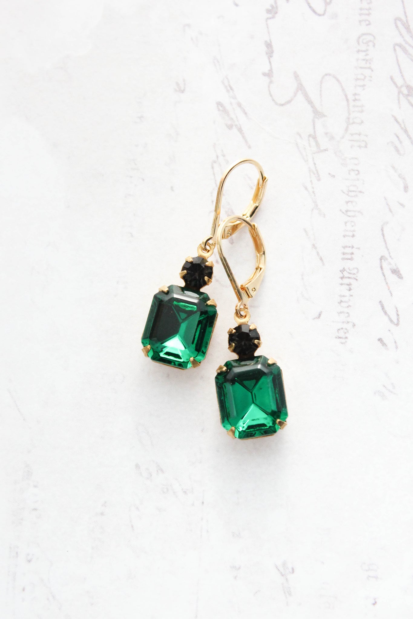 These are beautiful vintage glass drop earrings in shades of Emerald Green and Black! The glass jewels are set in antiqued brass settings and the stones are a rectangular emerald green glass jewels on the bottom and set on the top are jet black crystals. These are lightweight and are lovely unique drop earrings.
