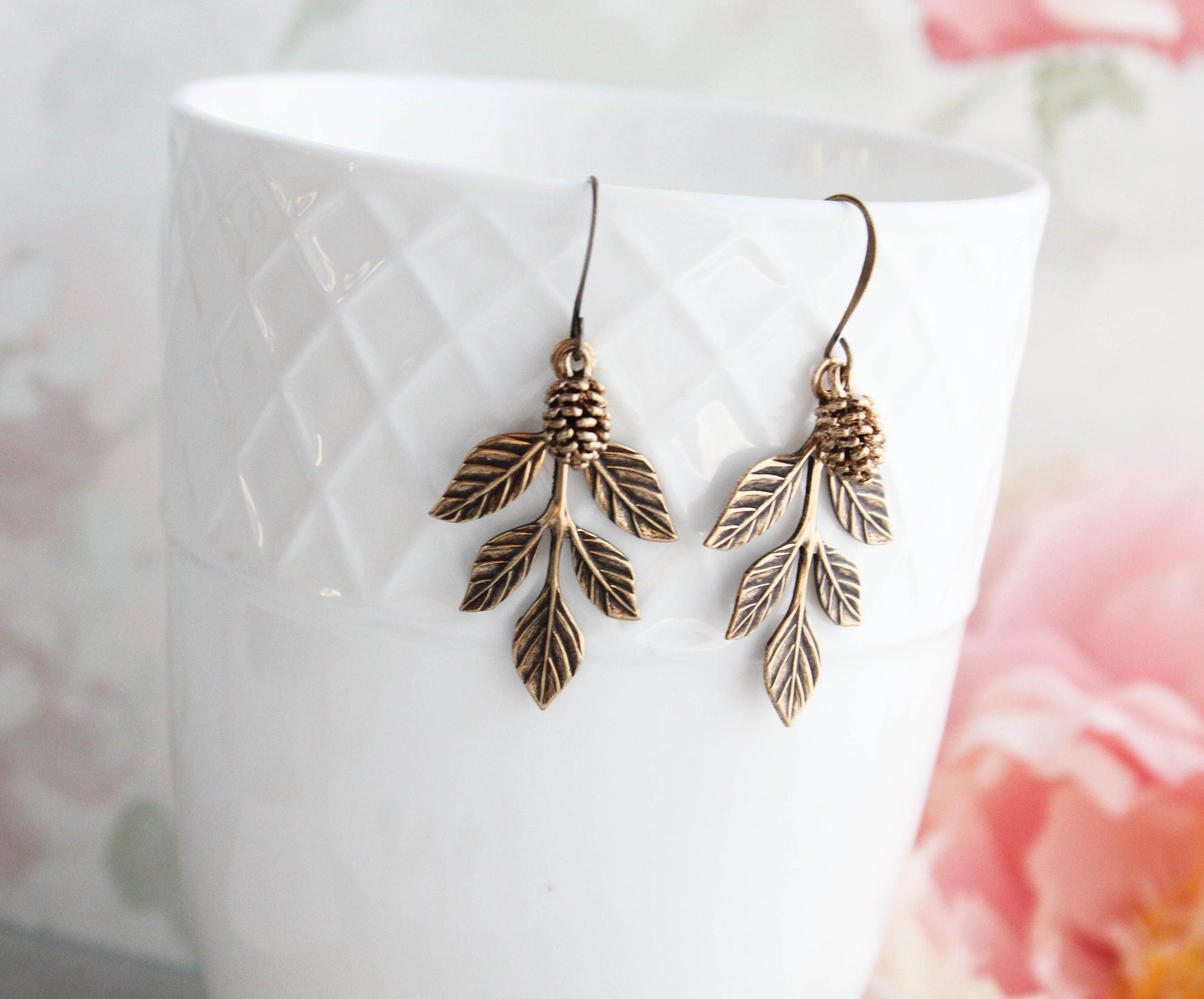 These are gorgeous antiqued gold brass branch and pine cone earrings! The branches have beautiful details and the little rustic pine cone in antiqued gold perfectly compliment them beautifully. The branches and pine cone dangle from nickel free antiqued brass ear wires! Beautifully detailed elegant nature inspired accessories that will soon become your favourite go-to earrings!