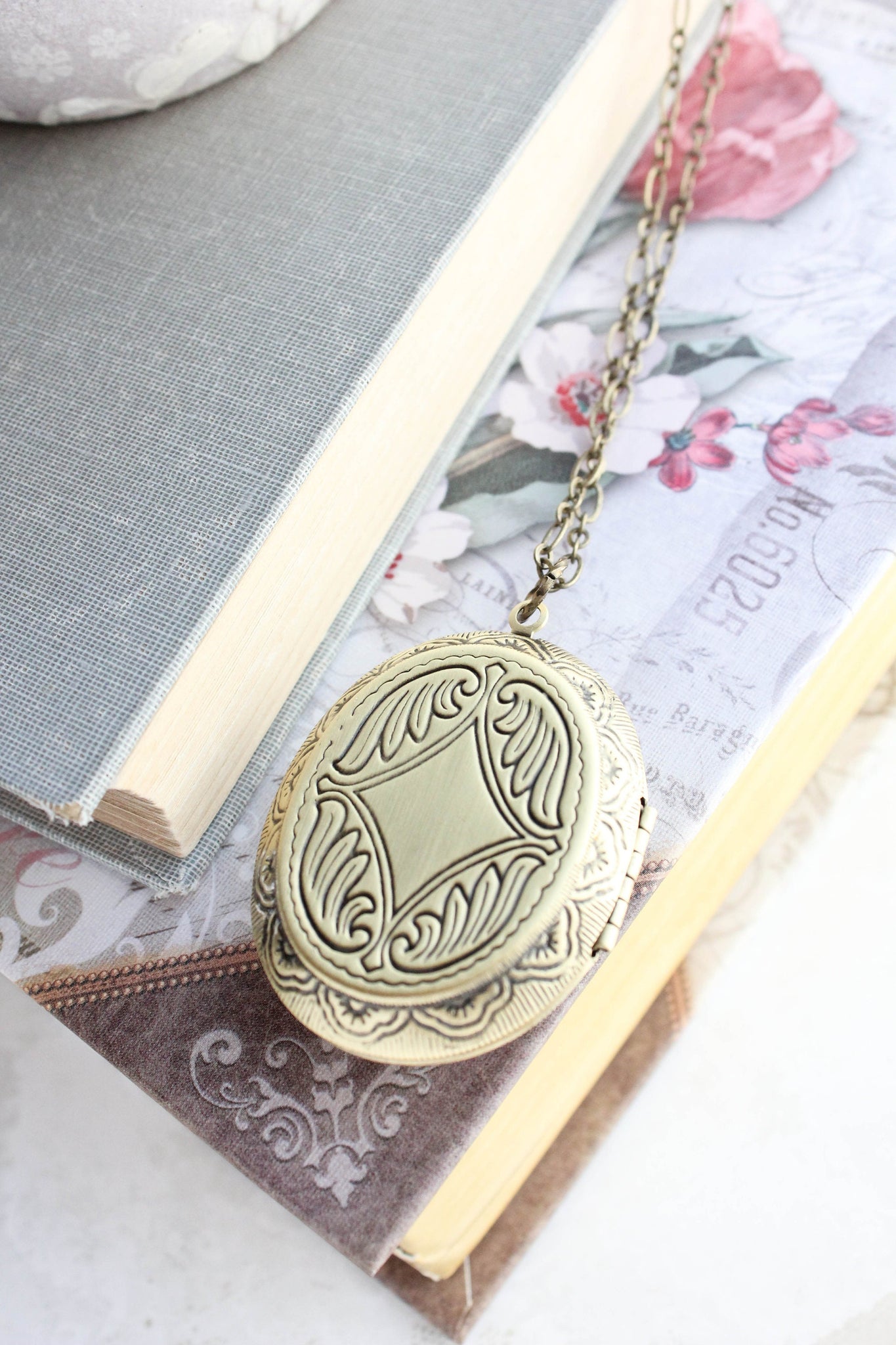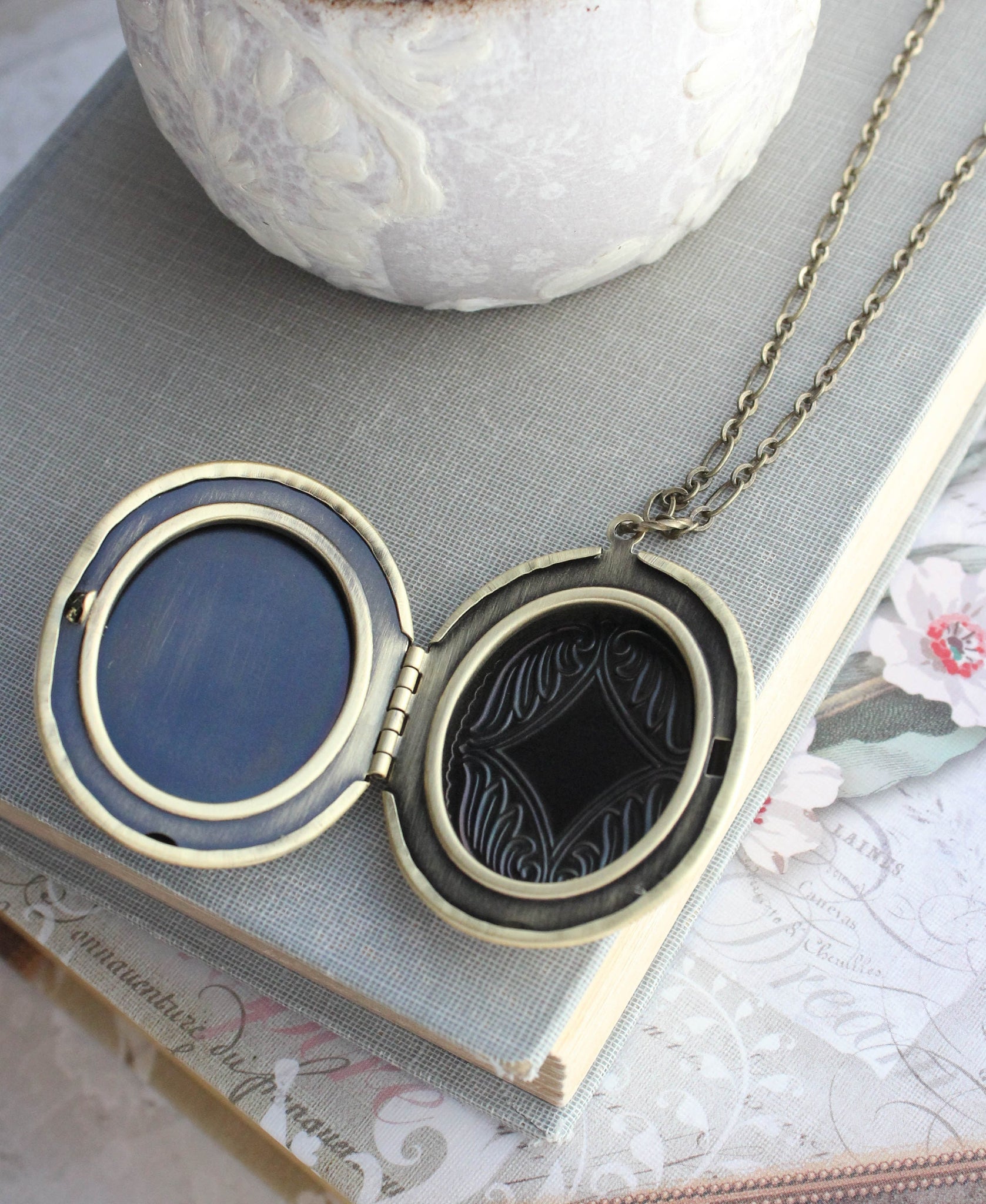 ~ The locket measures 1.5"w x 1.75 "h (36mm x 45mm) and has two oval frames inside for pictures or a special secret hiding spot for your own personal treasures.