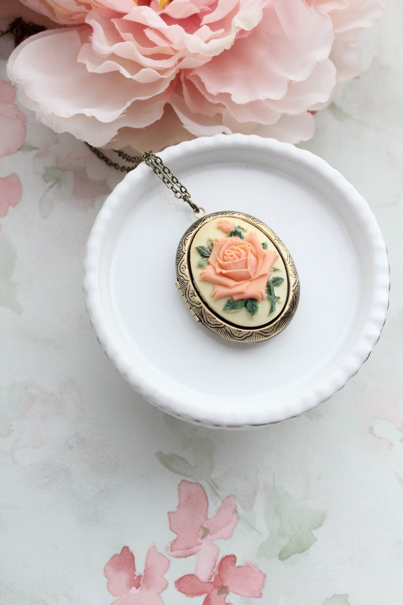 This is a gorgeous statement necklace with a big oval locket pendant in antique brass. The focal on the front of the locket is a resin cameo with a peach rose on a butter cream background. This photo locket has beautiful details and will be a lovely accessory to store your treasured photos and mementos.